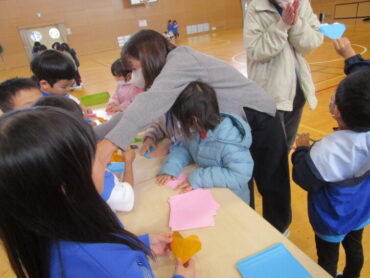 また、年長児さんも「先生見て!上手に折れたよ」「野村小学校のキャラクターは、『のむらっこ』っていうんだ」「ランドセルかっこいい」など楽しそうに1年生と関わる姿が見られました。