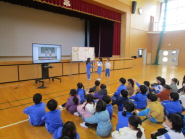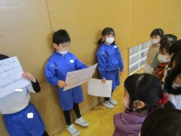 12月16日(火)こばと幼稚園の年長児さんが野村小学校に来てくれました。1年生は、集会名を決める際、「えがお集会」「にこにこ集会」「なかよし集会」等、意見を出し合い、年長児さんも自分たちも笑顔で、仲よくなるという目当てをもって準備を進めてきました。