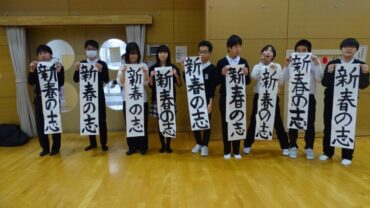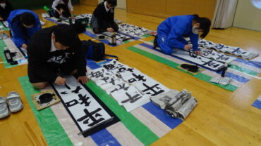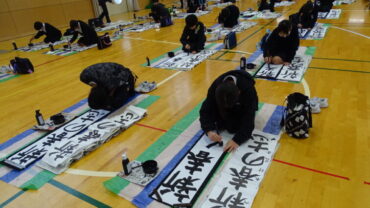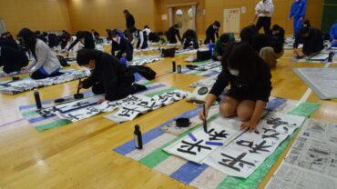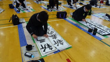 外は雪が降り、冷えた体育館でしたが、力強い筆遣いで一文字一文字丁寧に書き上げました。
