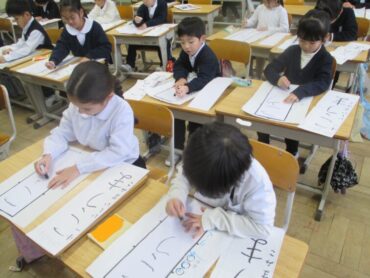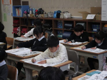 2026.1.13 1年生 2年生 校内書初大会(低学年) 1、2年生は教室で書初大会を行いました。練習したことを思い出して、心を落ち着かせて、正しい筆順で丁寧に書いていました。一人一人が集中して静かに書き初めを行っていました。