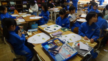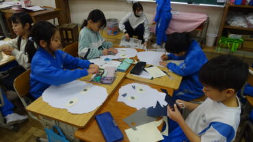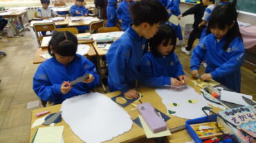 2年生の教室では、図画工作科の授業をしていました。パーツごとに紙を切って鬼の顔をつくっていました。色んな表情の鬼の顔がありました。
