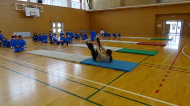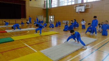 縄跳びで体を温めた後は、マット運動をしていました。「自分の腕で体を支えて起き上がろう」と