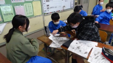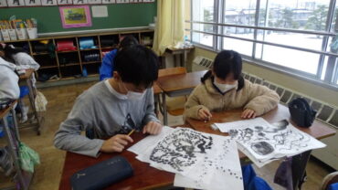 6年生は、墨で書いた模様が何に見えるのか、作品をいろいろな角度から眺めたり、友達に相談したりながら、作品の説明を書いていました。「へぇ〜、そんなふうに見えるんだ」など、友達と会話が弾んでいました。