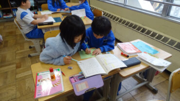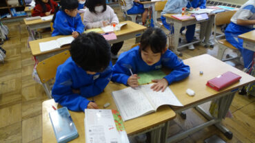 隣の2年生の教室では、ペアで漢字クイズを考えていました。「漢字を左右、上下に分けて考えるとどんな漢字になるのかな」と友達と相談しながら問題をいくつもつくっていました。