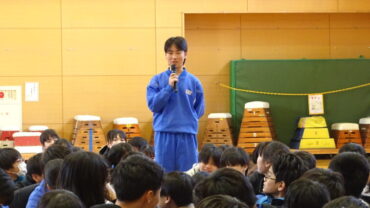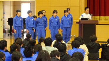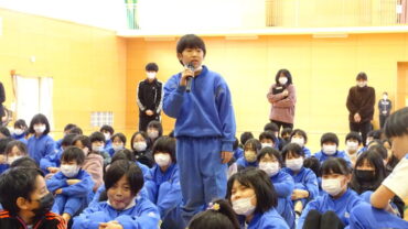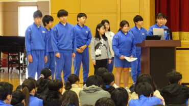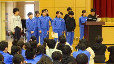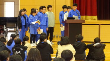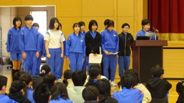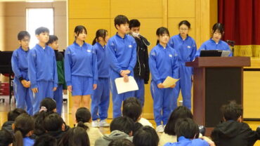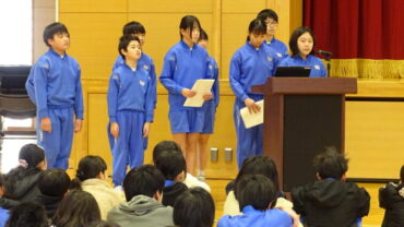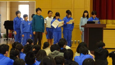 給食委員会は、企画した突撃インタビューやセレクト献立が好評だったこと等を発表しました。運動委員会は、ソフトボール投げ教室やランニング練習を行い運動好きが増えたこと等を発表しました。