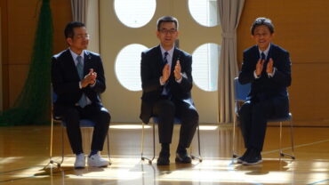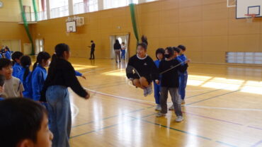 この日は、出町譲高岡市長が本校を訪問され、一緒に応援していただきました。結果は1回戦と2回戦の合計で144回跳んだ1組が優勝しました。元気いっぱいの3年生でした。