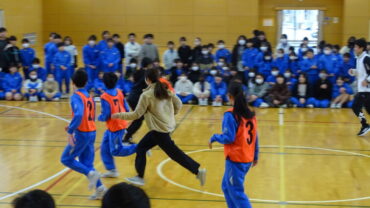 長休み時間に6年生の卒業プロジェクトチームが企画した「先生方対6年生の思い出バスケットボール対決」がありました。