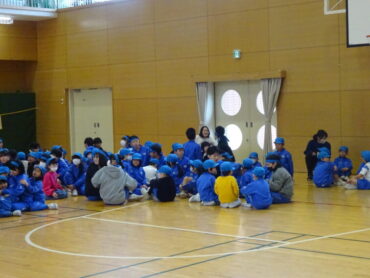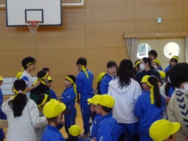 1・2年生と6年生で猛獣狩りをしました。色団ごとに分かれて、指定された動物の名前の文字数でグループをつくって集まります。グループには、1・2・6年生の3つの学年の人が混ざらなければなりません。6年生が見本を示してくれました。