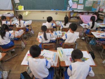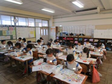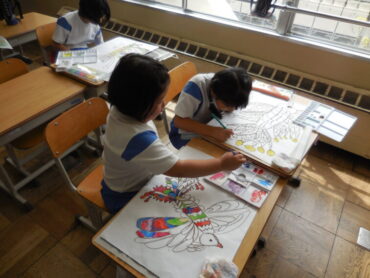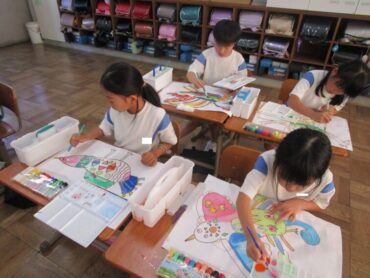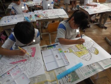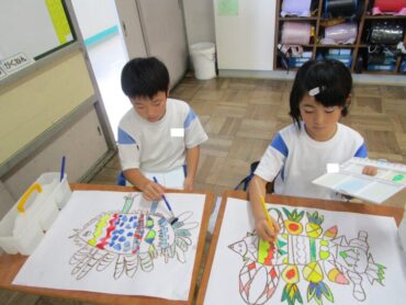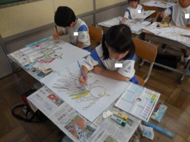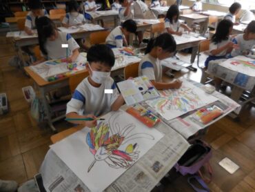図画工作科の時間に、子供たちは「まぼろしの鳥」を描いています。