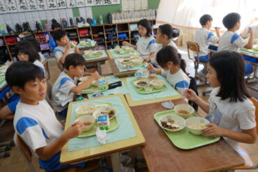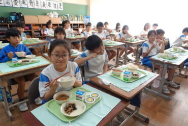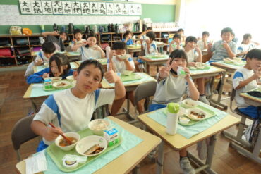 2025.10.9 給食 全校児童 中秋の名月にちなんで(お月見給食) (10月6日) 6日は中秋の名月にあたり、この日の給食は、「お月見献立」でした。 主食は、秋の味覚の栗が入った「栗ご飯」です。栗がホクホクして、いつもよりご飯が進みました。 「だんご汁」には、大根やごぼう等のたっぷりの野菜とモチモチした「たんご」が入っていました。 「お月見ゼリー」は、爽やかなマスカット味で、中に月がふんわり浮かんでいるような可愛いゼリーでした。 昔から伝わる季節の行事について給食を通じて、学ぶ機会になってくれたらと思います。