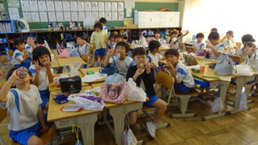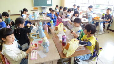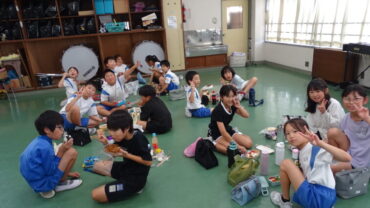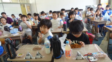 無事ステージ発表が終わり、控室ではほっとした様子の野村っ子たちが、友達と楽しく昼食を食べていました。