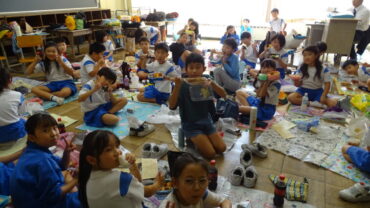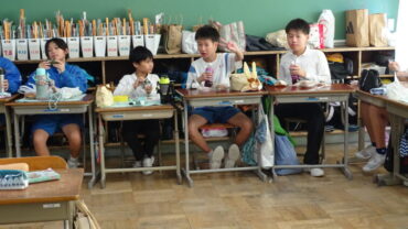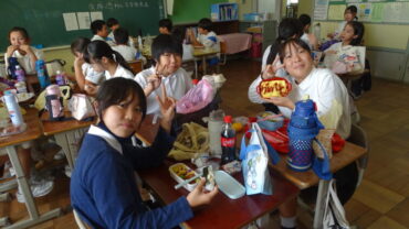 6年生は、係の仕事を終え、昼食を食べていました。この後、劇の本番でした。「がんばれ」のメッセージ入りのお弁当を見せてくれました。