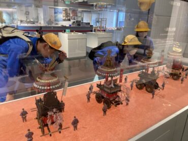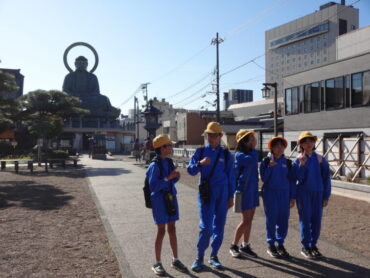 高岡の伝統工芸にまつわる場所を各班で巡りました。今回は、古城公園をスタートとゴール地点に設定し、高岡大仏、ドラえもんの散歩道、高岡御車山会館、高岡鋳物資料館をチェックポイントとして、事前に各班で回る順番を話し合って決めました。