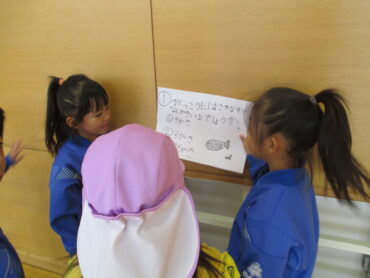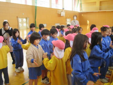 年長児さんに楽しんでもらいたい、自分達のかっこいい姿を見せたいと取り組んだなかよし集会。堂々と言葉を話したり、優しく笑顔で教えたりしながら交流しました。