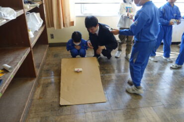 自分でつくったおもちゃで遊びながら、友達のおもちゃと距離や速さ等を比べていました。「さらにパワーアップするためにどんなところを工夫すればいいのかな」と、友達と相談しながらつくっていました。