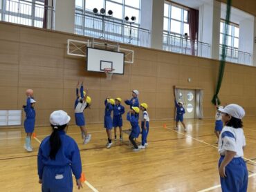 ボールなげゲームは、チームの仲間とパスをつないでゴールをするゲームです。子供たちは、得点につながるように、攻め方や投げ方を工夫して行っています。
