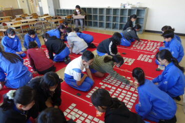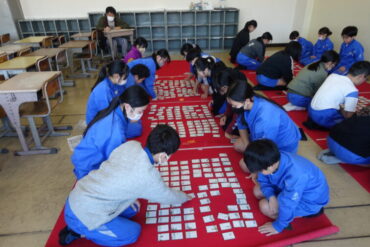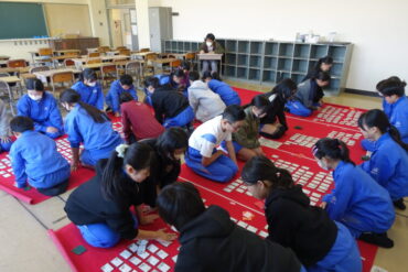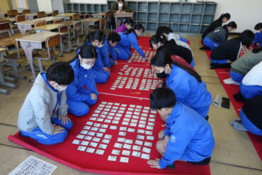 2025.11.28 5年生 6年生 万葉かるた朝練習 (11月27日) 万葉かるた朝練習が始まりました。5、6年生の希望者が集まり、朝の15分間、真剣勝負をしています。今年度から初参加の5年生も集中して練習をしていました。 読み手が上の句を読み上げる前に、「パン」と札を取る音が室内に響きます。静かな教室に緊張した雰囲気が広がっていました。 互いに切磋琢磨し合い、「万かる名人」を目指してほしいと思います。