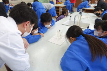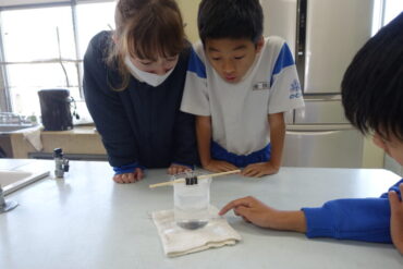5年生は理科室で、食塩を水に溶かすとどうなるのか実験をして確かめていました。「水の中に油みたいなものが見えるよ」などと、呟いていました。これからものの溶け方について学習していきます。