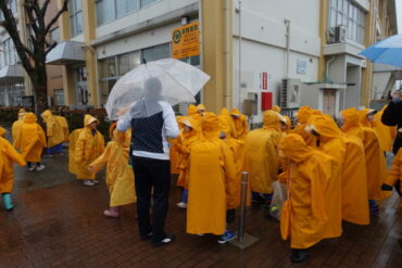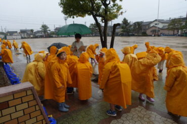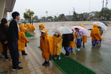 1、2年生は、昇降口前に並んで先生と人数確認をしていました。雨なのでカッパを着るとみんな同じように見えます。下校班の友達が揃った班から一列に並んで下校していました。