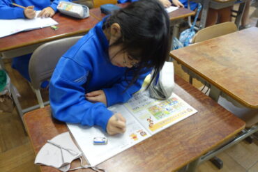 6年生のある教室では、将来の夢を人形に表現していました。「サッカー選手になりたい」「自動車の整備士になりたい」「フルート奏者になりたい」など、夢を教えてくれました。音楽室では、歌のテストを行っていました。素敵な高音の歌声にうっとりと聴き入ってしまいました。