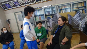 お別れ会では、フルーツバスケットをして仲よく楽しみました。「メガネを掛けている人」「ジャンパーを着ている人」等、みんな上手な日本語で会話をしていました。