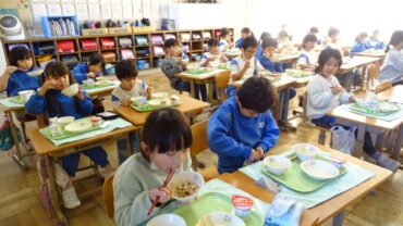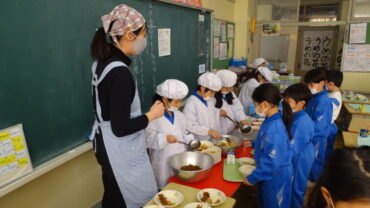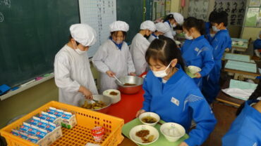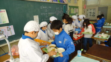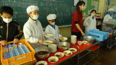 各教室では、給食当番が上手に盛り付けをしていました。とってもよい香りに食欲がそそられます。