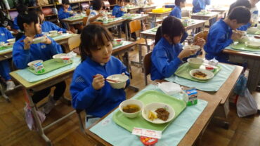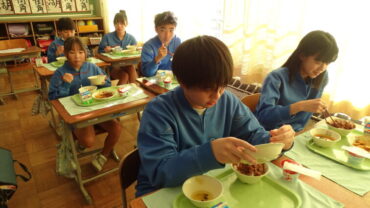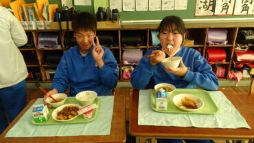 この日の給食は、高岡で育てられた地場産物が入った「たかおか食19丼(しょくいくどん)」でした。南条・木津地区の大根、戸出・中田・福岡地区の人参、国吉地区の椎茸が入っていて栄養満点でした。
